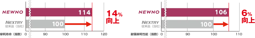 次に耐摩耗性。NEWNOは、摩耗寿命が従来品に比べて14%も向上していると公表されている。